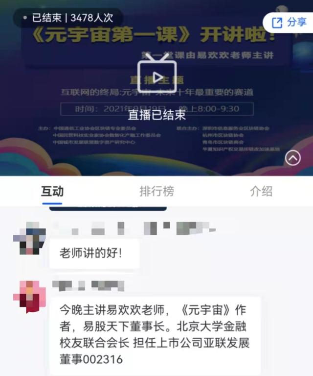 记者在回放页面看到,该场直播课程点击量为3478人次。平台内还有其他与元宇宙相关的免费课程可随时观看,主讲人包括证券行业分析师、高校教授、区块链领域专家等,点击量在几百至几千人次不等。