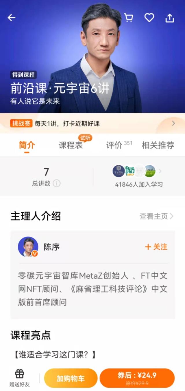 近日,罗振宇创立的得到APP上出现了价格为29.9元的音频网课《元宇宙6讲》。天目新闻记者注意到,截至12日晚间,学习人数已突破4.1万人。在不考虑课程优惠的情况下,该网课总营收已超过100万元。