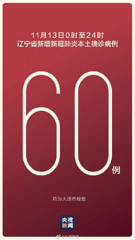 【#辽宁新增60例本土确诊#】11月13日0时至24时,辽宁省新增60例本土新冠肺炎确诊病例,为大连市报告;新增1例境外输入新冠肺炎确诊病例(为无症状感染者转归),为沈阳市报告。(总台记者李承泽)