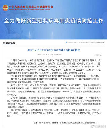 【#11月13日新增确诊病例89例# #11月13日新增本土病例70例#】据国家卫生健康委员会网站,11月13日0—24时,31个省(自治区、直辖市)和新疆生产建设兵团报告新增确诊病例89例。其中境外输入病例19例(天津5例,上海5例,山东2例,四川2例,云南2例,辽宁1例,广东1例,广西1例),含2例由无症状感染者转为确诊病例(辽宁1例,四川1例);本土病例70例(辽宁60例,均在大连市;河北3例,均在辛集市;黑龙江2例,均在黑河市;江西2例,均在上饶市;云南2例,均在德宏傣族景颇族自治州;四川1例,在成都市)。无新增死亡病例。无新增疑似病例。