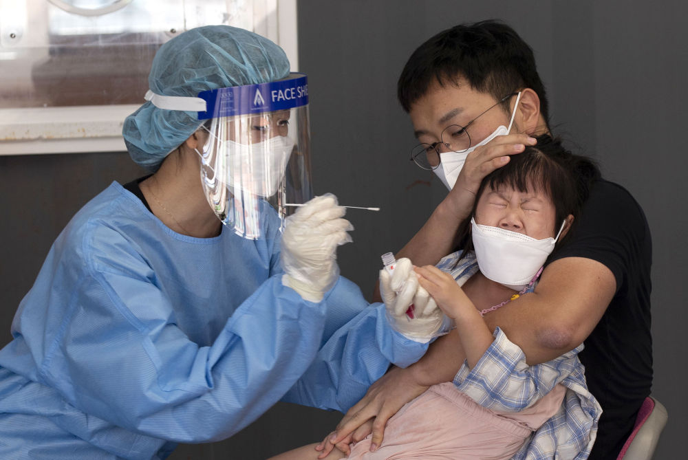 9月18日,在韩国首尔火车站附近,一名医护人员给一名儿童做核酸检测。(新华社发,徐儒锡摄)