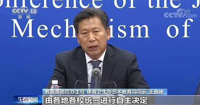 教育部防控办主任 体育卫生与艺术教育司司长 王登峰:我们要根据各地各校的实际情况,鼓励所有的高校在属地管理的前提下,按照属地管理的要求再结合校园防控的要求,以及课程进展的情况、学习安排的情况,由各地各校统一进行自主决定。