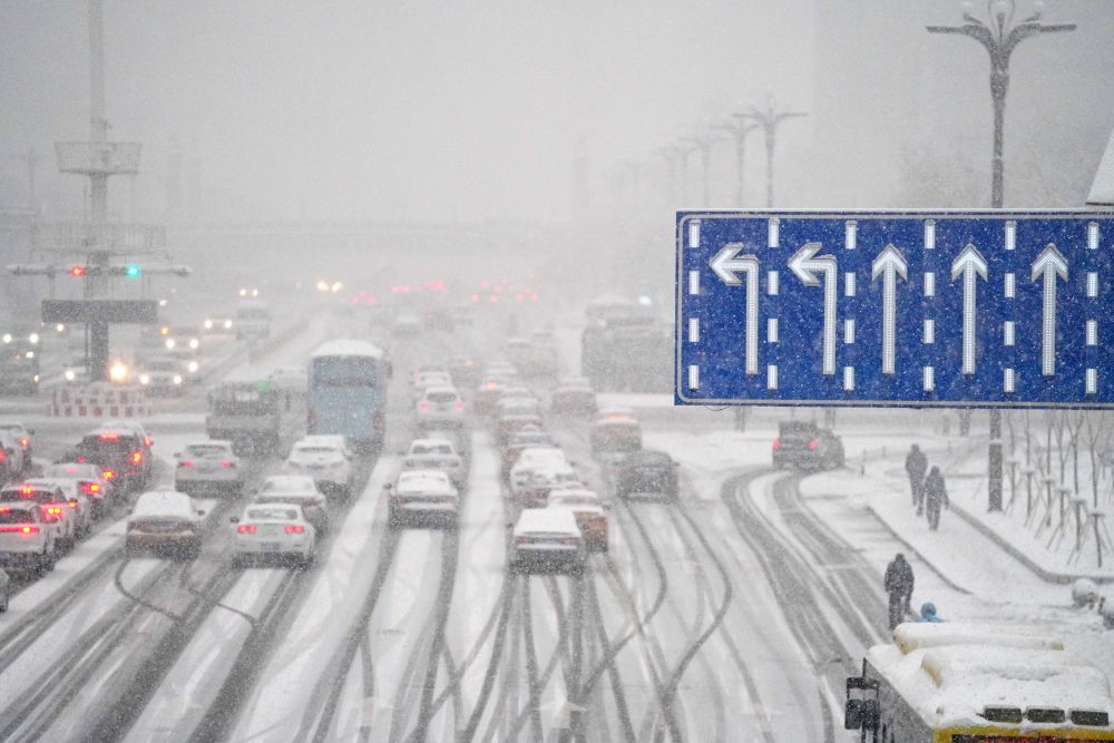 11月9日,在哈尔滨主干道中山路上,车辆在风雪中行驶。