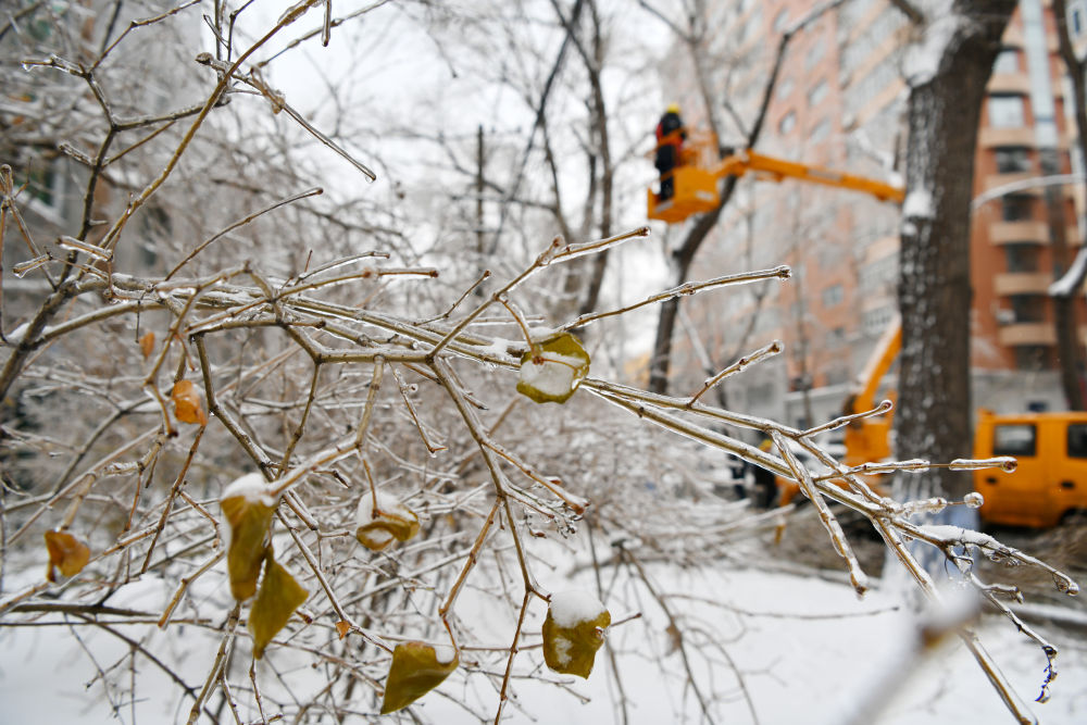11月9日,园林部门工作人员在哈尔滨一路段清理被冰雪压倒的树木。