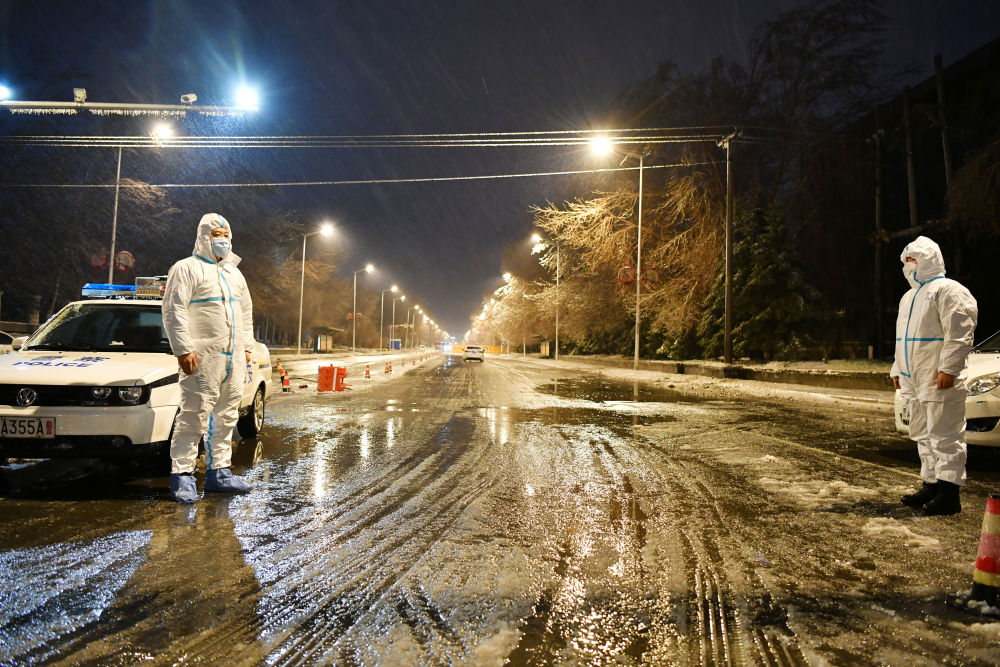 11月8日,在哈尔滨市平房区,两名公安人员检查封闭小区围挡。