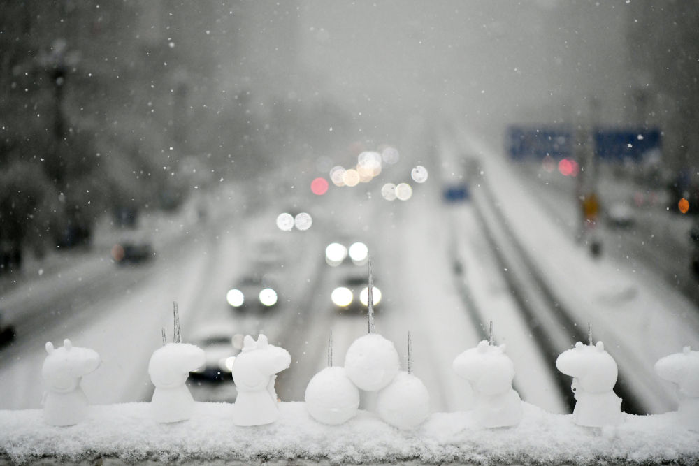 凄风冷雪中,也有意趣盎然。我们能看到的,只是在这个极端天气下的俏皮诙谐画面:风雪中,在一个过街天桥的护栏上,几只用雪做的小猪佩琪对着三个雪球相向而立,其中几只头顶还滑稽地插着冰溜子,它们身后是天桥下冒雪行驶的车辆,正闪着迷离的灯光。不知道这是哪个孩子的顽皮,亦或是一对情侣的小温馨……