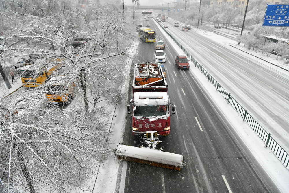 11月9日,环卫工人在哈尔滨一路段进行清雪作业。