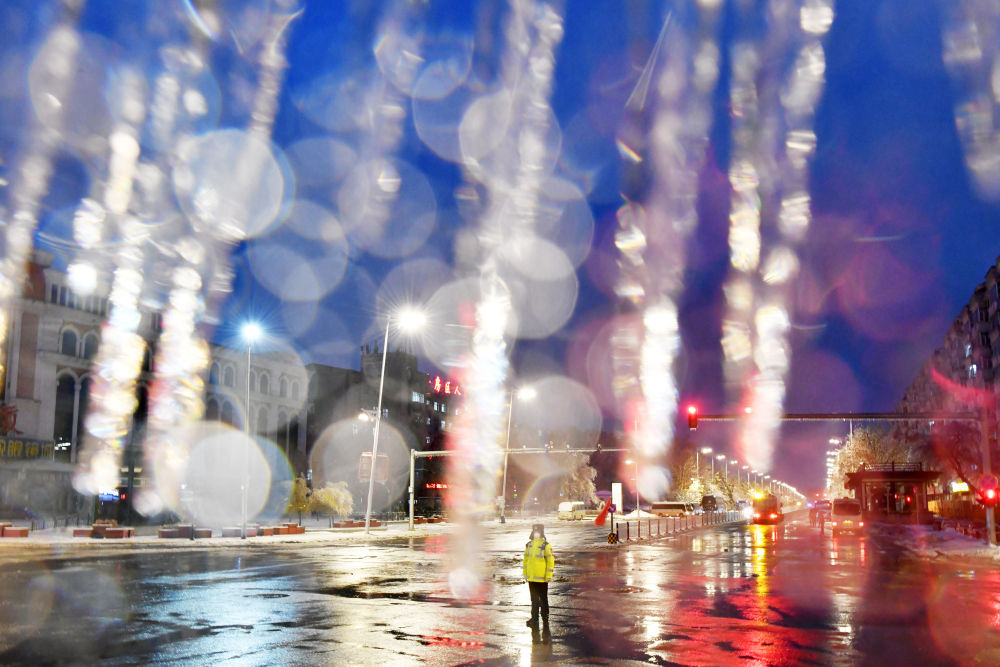 抢在冰城彻底“糖化”之前,我们赶到了平房区。冻雨敲打着人们冰冷的脸庞,喊哑了嗓子累得蹲到地上的志愿者,帮着往封闭小区搬运物资的公安干警,顶着寒风冷雨指挥车辆的交通辅警,站在冰水混合物里的进出城卡点工作人员……他们,像是移动的冰人,默默坚守着,身后的树枝冰挂在路灯照射下,闪耀出璀璨的光芒。
