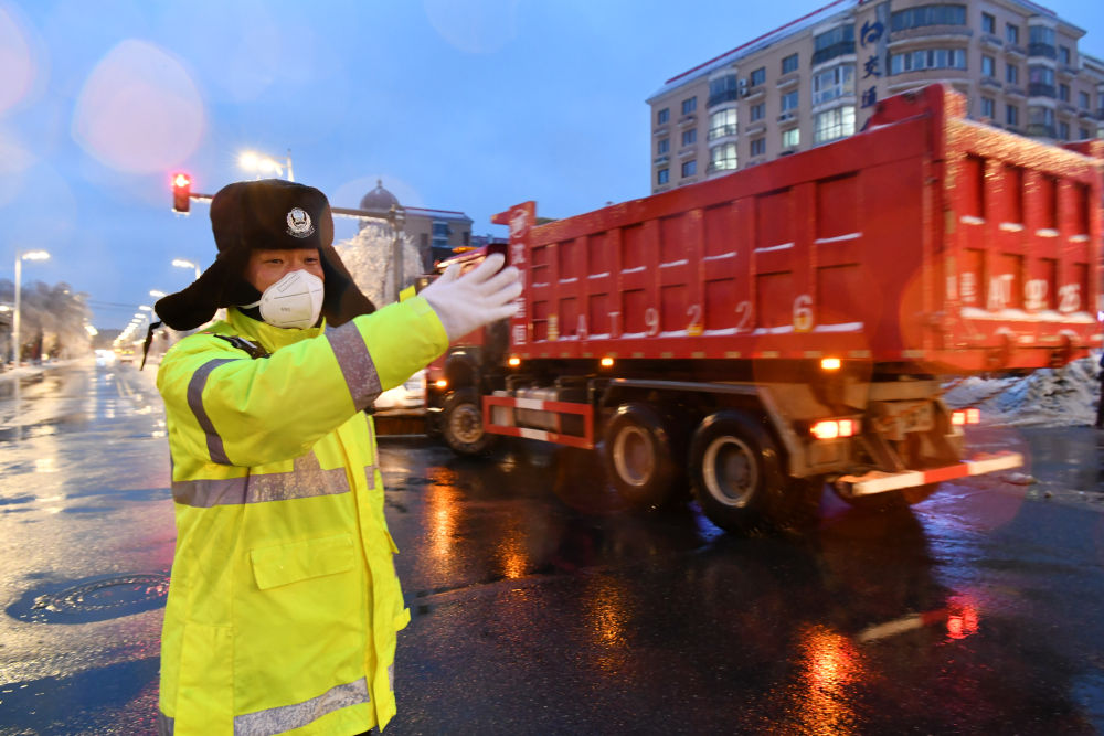 11月8日,在哈尔滨市平房区,一名交通辅警在冻雨中指挥交通。