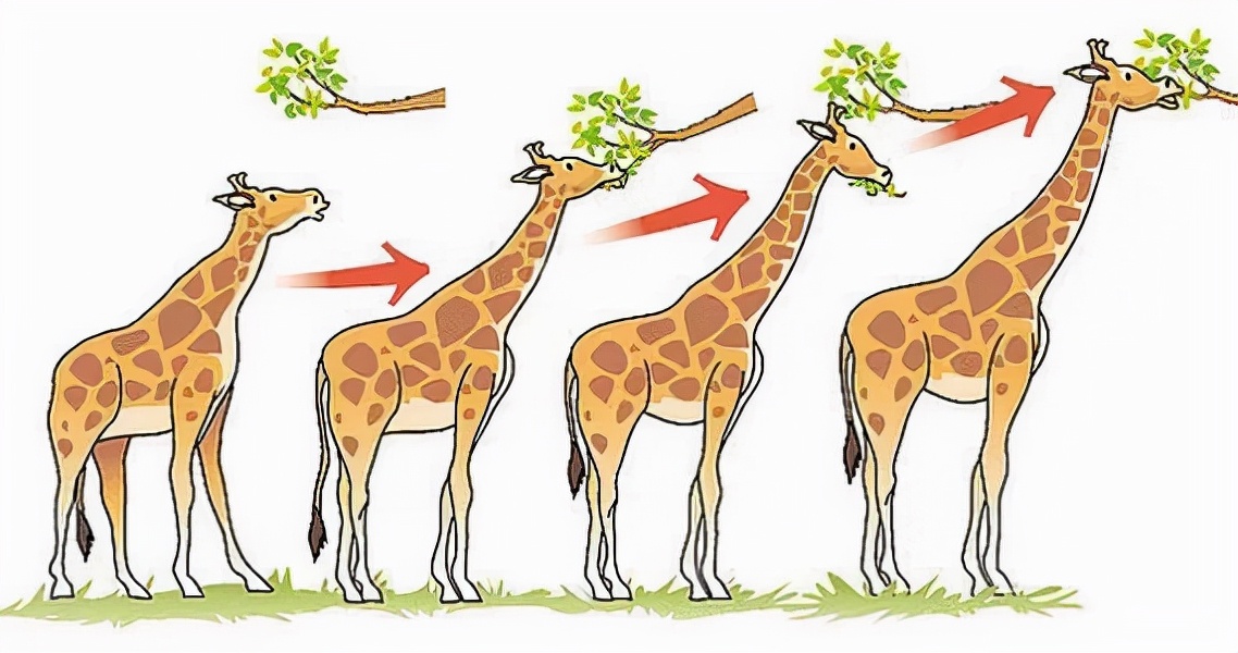 比如:长颈鹿之所以脖子长,是因为它们每天都在伸脖子,久而久之脖子就变长了,之后又将长脖子基因遗传给了后代。