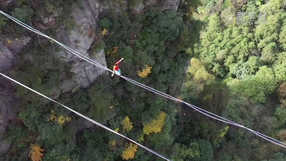 #张家界1092米高空扁带上赤脚行走#【惊险!#千米高空扁带行走是怎样一种体验#?】14日,为期两天的2021年张家界黄石寨全国扁带精英挑战赛在旅游胜地湖南省张家界武陵源景区落下帷幕,来自国内的10名扁带选手在海拔1092米的高空展开惊险竞技。选手们在峰巅间架起的扁带上赤脚行走,给观众带来强烈的视觉冲击。 新华社的微博视频