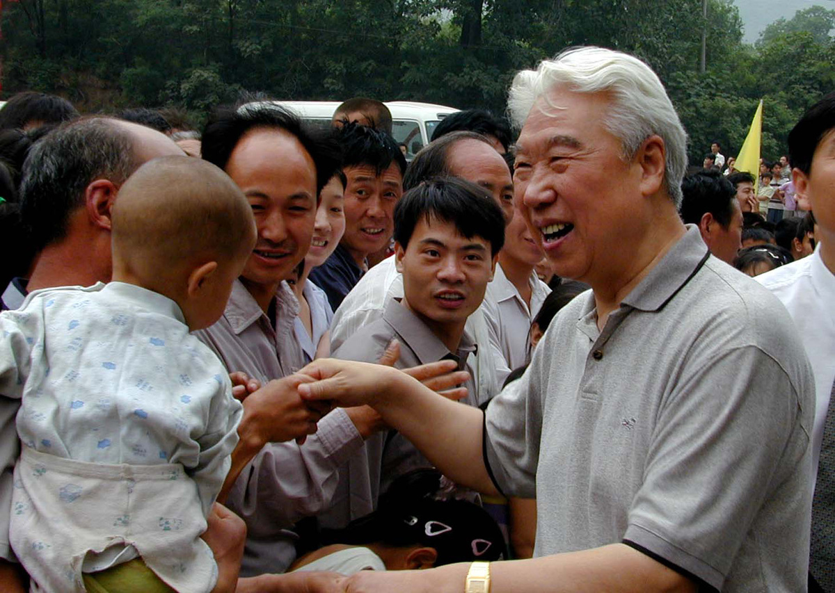当年林县的县委书记杨贵(前右)回到林州受到乡亲们的热情欢迎(2001年摄)。新华社记者王颂摄