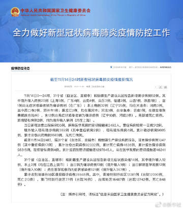 截至11月14日24时,据31个省(自治区、直辖市)和新疆生产建设兵团报告,现有确诊病例1347例(其中重症病例17例),累计治愈出院病例92332例,累计死亡病例4636例,累计报告确诊病例98315例,现有疑似病例4例。累计追踪到密切接触者1297645人,尚在医学观察的密切接触者46241人。
