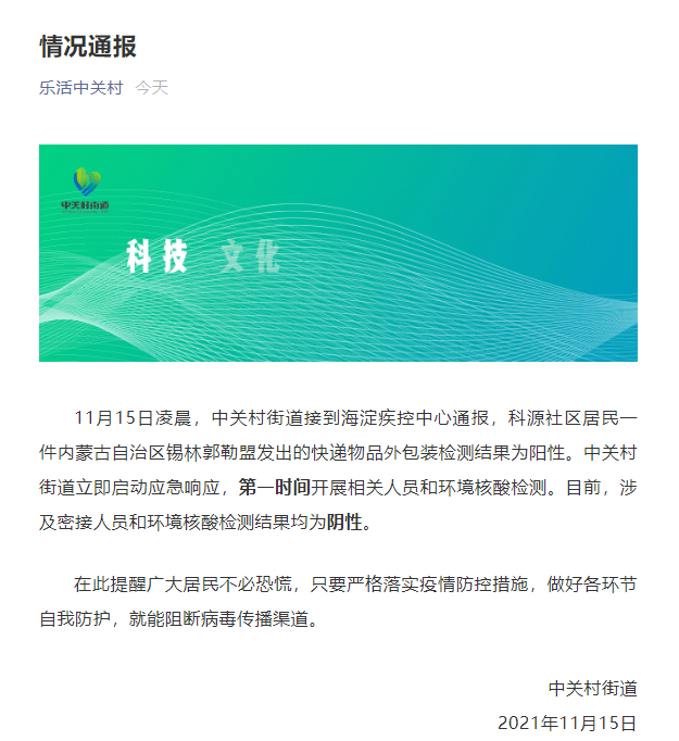 11月15日凌晨,中关村街道接到海淀疾控中心通报,科源社区居民一件内蒙古自治区锡林郭勒盟发出的快递物品外包装检测结果为阳性。中关村街道立即启动应急响应,第一时间开展相关人员和环境核酸检测。目前,涉及密接人员和环境核酸检测结果均为阴性。