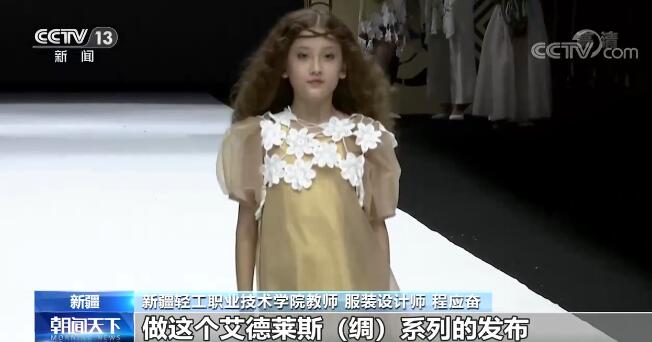 新疆轻工职业技术学院教师 服装设计师 程应奋:我是从2014年开始,每年在国际时装周做艾德莱斯(绸)系列的发布。从刚开始我们都不太了解这个面料到后来我们站在时装周的舞台受到大家的关注和喜爱,我觉得这是我们很欣喜看到的一个变化。
