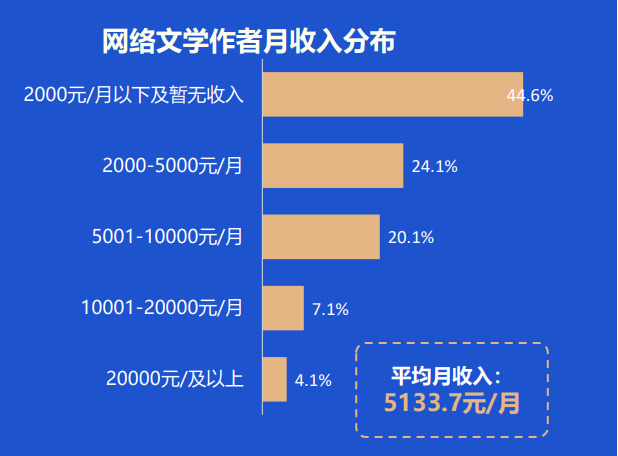 中国音像与数字出版协会发布的《2019年度中国网络文学发展报告》显示,2019年中国网络文学行业市场规模达到201.7亿元,网络文学作者数量达到1936万人,签约作者数量达到77万,但网文作者平均月收入5133.7元,近七成的作者收入不超过5千元。