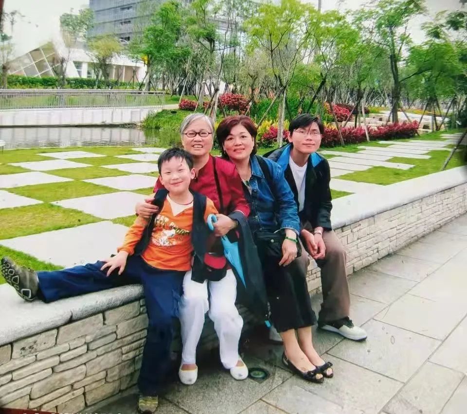 在上海崇明定居的老台胞王谨敏(左二)带着孙子赴台探亲,与妹妹和外甥合影。(受访者供图)