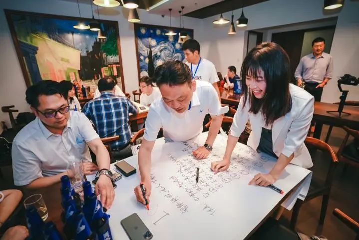 在南京创业发展的台胞钱振汉(中)与创业台青交流。(受访者供图)