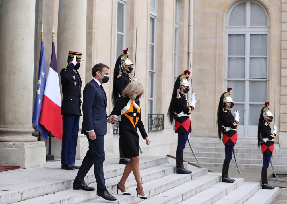 4月16日,在法国巴黎总统府爱丽舍宫,法国总统马克龙和夫人布丽吉特迎接到访的乌克兰总统泽连斯基夫妇(不在画面中)。(新华社记者高静摄)