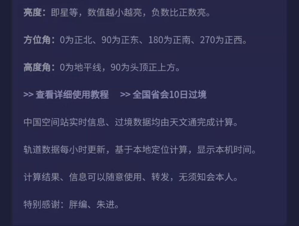 看到空间站的时间,有一个复杂的计算过程,我也看不懂,最简洁的办法,就是使用一个叫“天文通”的微信小程序,里面有一个链接,就可以看到自己所在地,能看到空间站的时间和方位。