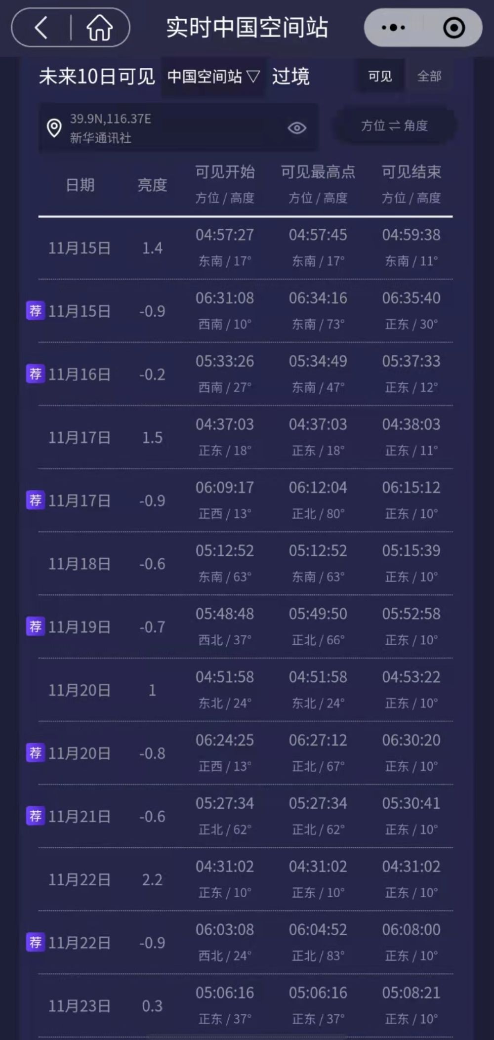 以我所在的位置为例,大家可以看到空间站出现的时间和方位是这样的: