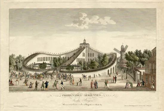 1817年,法国人又做了改进,轮子更结实,坡上装上了轨道。巴黎这座名叫 “空中漫步”(法语名称“The Promenades-Aériennes”)的滑梯,被认为是史上第一座现代过山车。