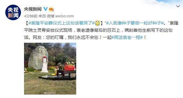 “人就像种子要做一粒好种子。”袁隆平院士灵骨安放仪式现场,袁老遗像背后的巨石上,镌刻着他生前写下的这句话。网友:您的叮嘱,我们永远不会忘!一起再送袁老一程!
