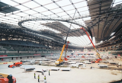 2019年11月,北京江河幕墙系统工程有限公司作业人员为国家速滑馆进行幕墙安装。资料图片