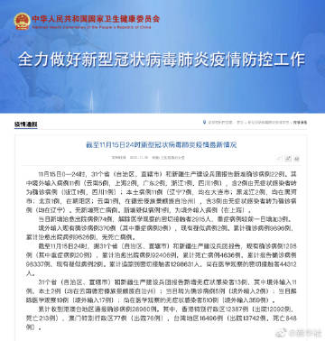 【#11月15日新增确诊病例22例# #11月15日新增本土病例11例#】据国家卫健委官网消息,11月15日0—24时,31个省(自治区、直辖市)和新疆生产建设兵团报告新增确诊病例22例。其中境外输入病例11例(云南5例,上海2例,广东2例,浙江1例,四川1例),含2例由无症状感染者转为确诊病例(浙江1例,四川1例);本土病例11例(辽宁7例,均在大连市;黑龙江2例,均在黑河市;北京1例,在朝阳区;云南1例,在德宏傣族景颇族自治州),含3例由无症状感染者转为确诊病例(均在辽宁)。无新增死亡病例。新增疑似病例1例,为境外输入病例(在上海)。