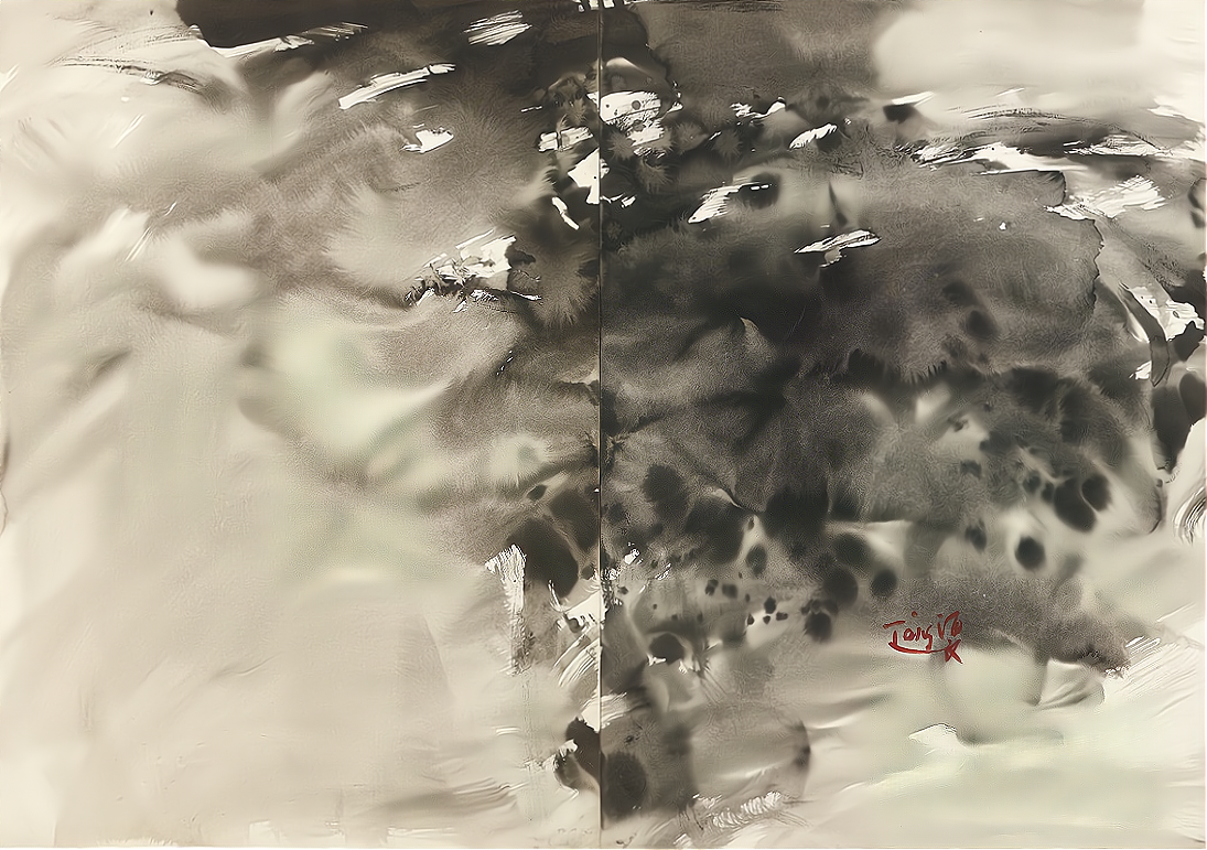 画家曾海文的创作囊括了水墨跟水彩两大类,究其作品的艺术特点是他将中国传统的水与墨的道家精神与毛笔之间摩擦出耐人寻味的火花,笔过留痕与水色交融互相传达着中国文人骨子里的东方精神,他的水彩画跟水墨作品画面同源,只有“素”与“色”的区别,其水彩画色彩酣畅淋漓,既带着东方美学的传统骨相,又带着西方表现主义的情感表达,他虽是留法画家,却地地道道地传达着东方的美学思想。#水墨画#
