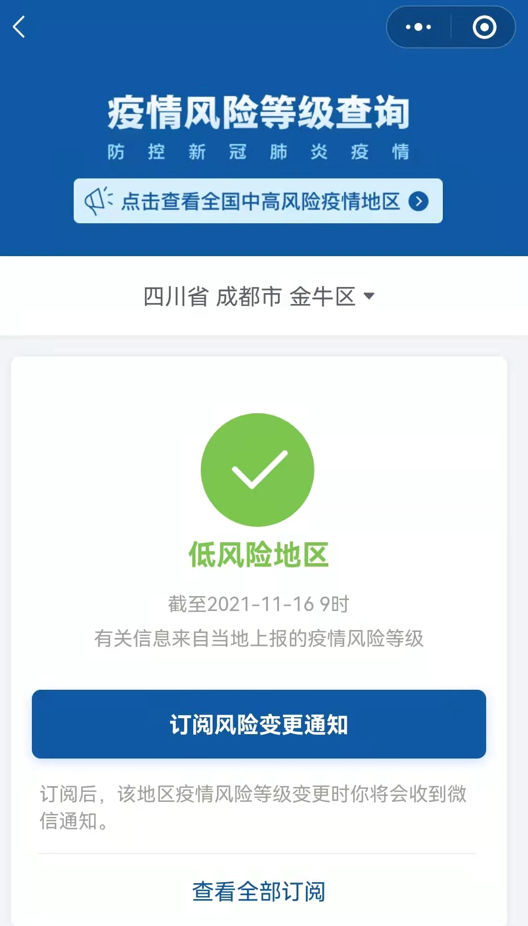 国务院客户端小程序11月16日9时更新数据显示,四川省成都市金牛区顶峰水岸汇景小区(一期、二期)降为低风险地区。