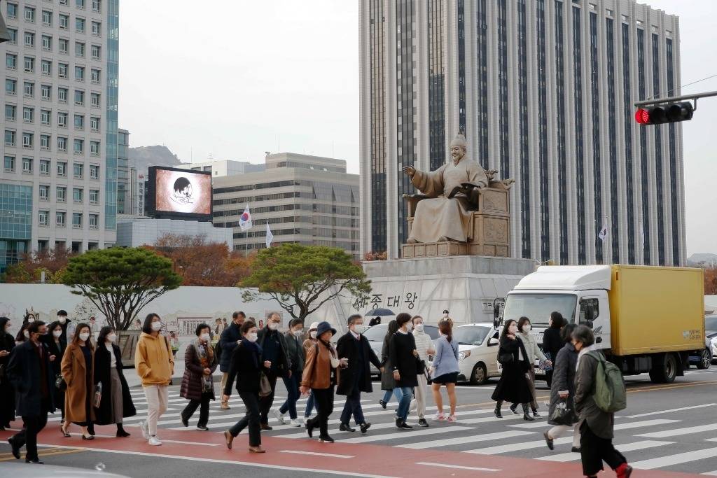 11月15日,在韩国首都首尔光化门广场,行人穿行过马路。(新华社记者王益亮摄)