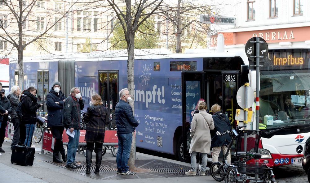 11月10日,市民在奥地利维也纳街头疫苗接种车前等待接种新冠疫苗。新华社记者 郭晨 摄