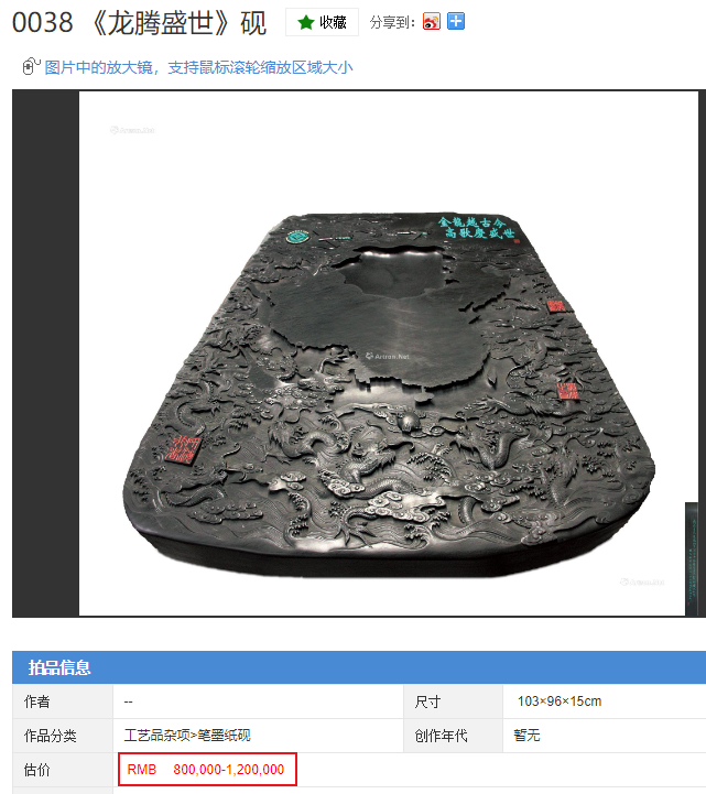 ◎2014年国家级非物质文化遗产代表性传承人曹阶铭亲制的《龙腾盛世》歙砚,拍卖估价就已经高达80万~120万。