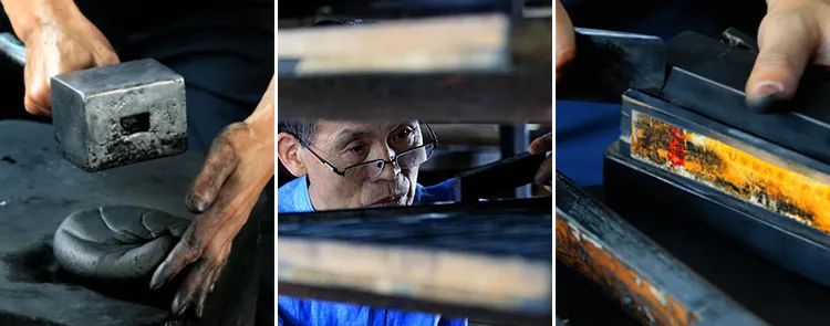 古法制墨,可分为点烟、做胶、配方、捶打、压模、晾墨、打边、描金等过程。