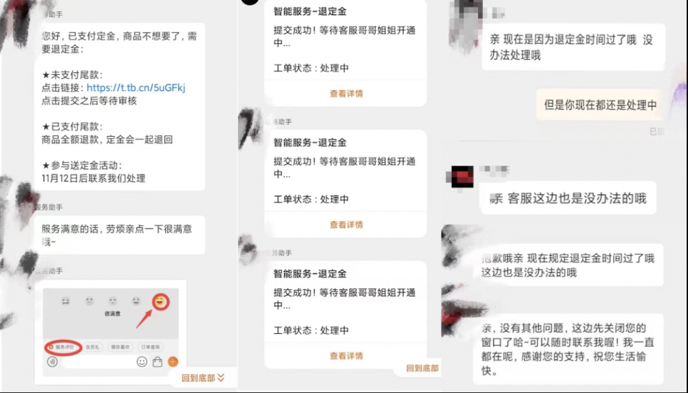 一些已经提交退定金申请的消费者还表示,被告知无法退还。“服务助手发来的好几条信息都是‘提交成功、处理中’,但后来就没消息了。几天后再去问客服,对方却表示退定金时间已经过了。”北京的小王告诉记者。