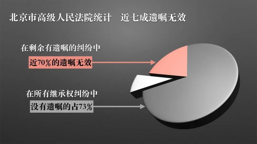 统计的结果是有73%的案件是因为没有遗嘱导致的,而有遗嘱的案件里面又有超过60%多的案件,是因为遗嘱无效最后导致了更多的纠纷。