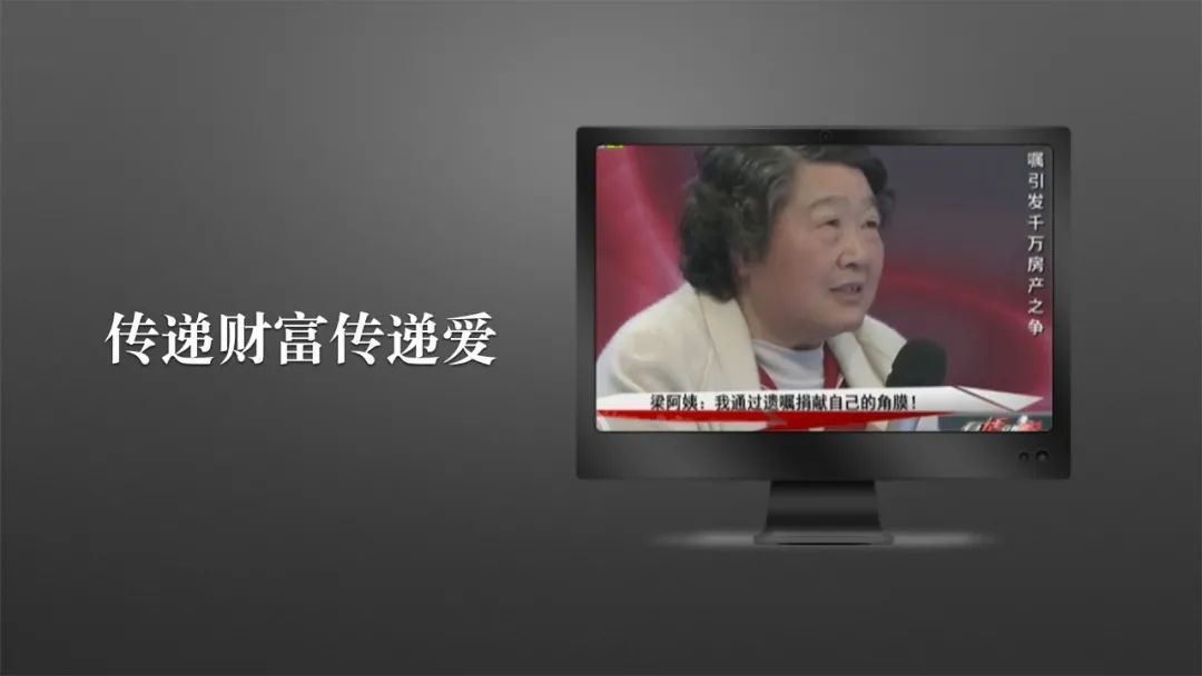 虽然梁阿姨跟女儿做了很多时间的沟通,但是得不到女儿的支持,所以梁阿姨在遗嘱里面专门表述了自己的这种愿望,希望得到女儿的配合,同时她也在遗嘱里面奉劝女儿,说你也应该捐眼角膜,应该帮助更多的人。她把她的遗嘱看成了一种传递家风、传递善心、传递爱的一个载体。