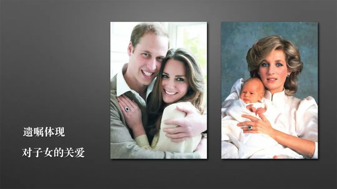 戴安娜王妃还有第二个安排,很温馨。大家看这幅图片,戴安娜手上的戒指这个时候戴在了她的儿媳妇凯特王妃的手指上。