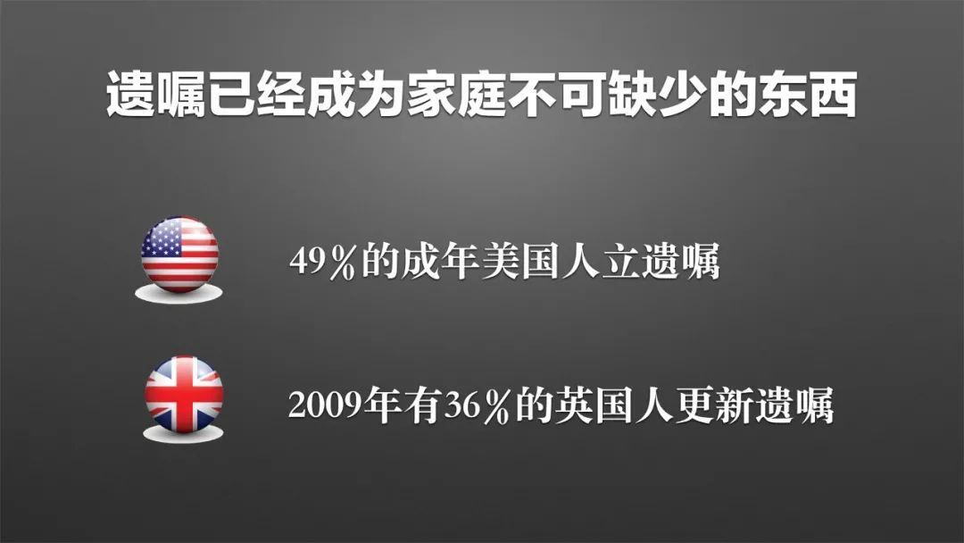 对于中国人来说,观念和西方人是不一样的。据调查,有49%的成年美国人立有遗嘱;英国一家媒体的调查,仅仅在2009年这一年,就有36%的英国人更新了自己的遗嘱,这就是英国人、美国人。西方人对遗嘱的概念和理念是:遗嘱已经成为家庭中不可缺少的东西。