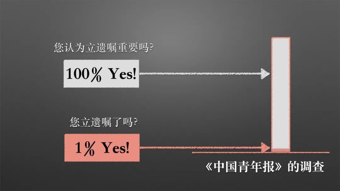 100%的人选“遗嘱很重要”;但是又问道:你写了遗嘱吗?只有不到1%的人选“我写了遗嘱”。