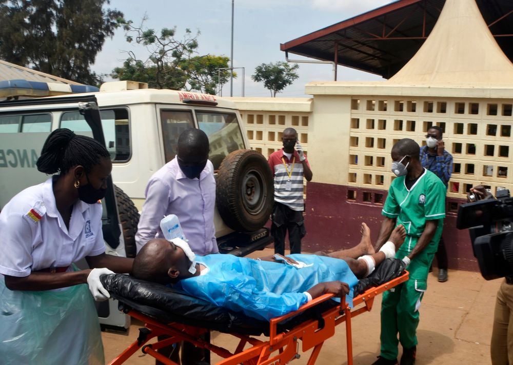 11月16日,乌干达首都坎帕拉发生爆炸事件,致多人死伤。图为医务人员将伤者抬出救护车。(新华社发,卡乔巴摄)