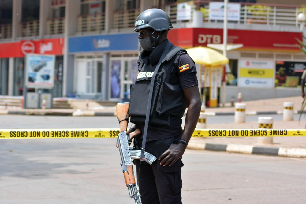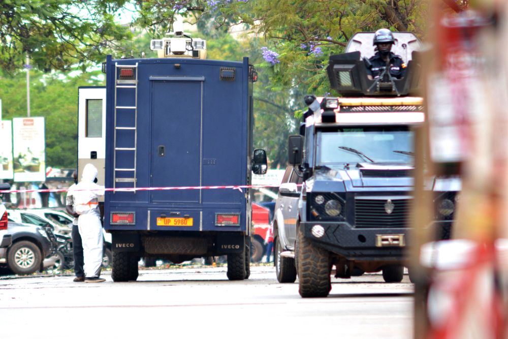 11月16日,反恐警察在乌干达坎帕拉的爆炸事件现场警戒。(新华社发,哈贾拉摄)