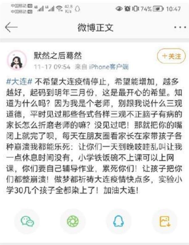 11月17日上午,一位自称老师的大连网友“默然之后蓦然”发布微博称,不希望大连疫情停止、希望越多越好,这引起广大网友的愤怒。