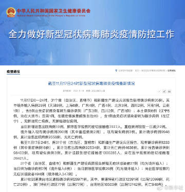 截至11月17日24时,据31个省(自治区、直辖市)和新疆生产建设兵团报告,现有确诊病例1233例(其中重症病例16例),累计治愈出院病例92534例,累计死亡病例4636例,累计报告确诊病例98403例,现有疑似病例3例。累计追踪到密切接触者1300285人,尚在医学观察的密切接触者39421人。