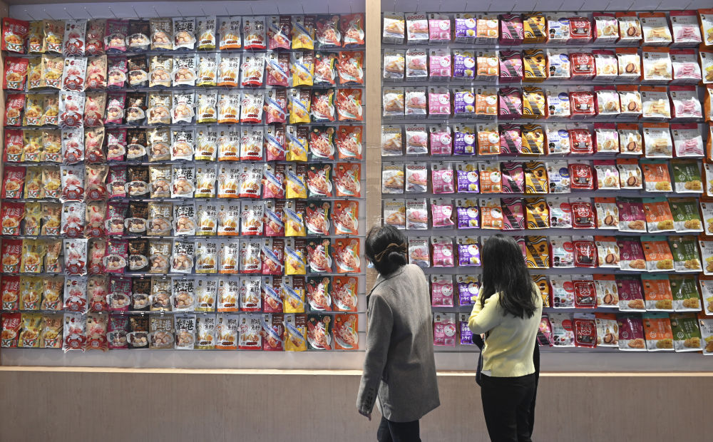 11月6日,观众走过第四届进博会食品及农产品展区一展台展出的各色零食。新华社记者 郝建伟 摄