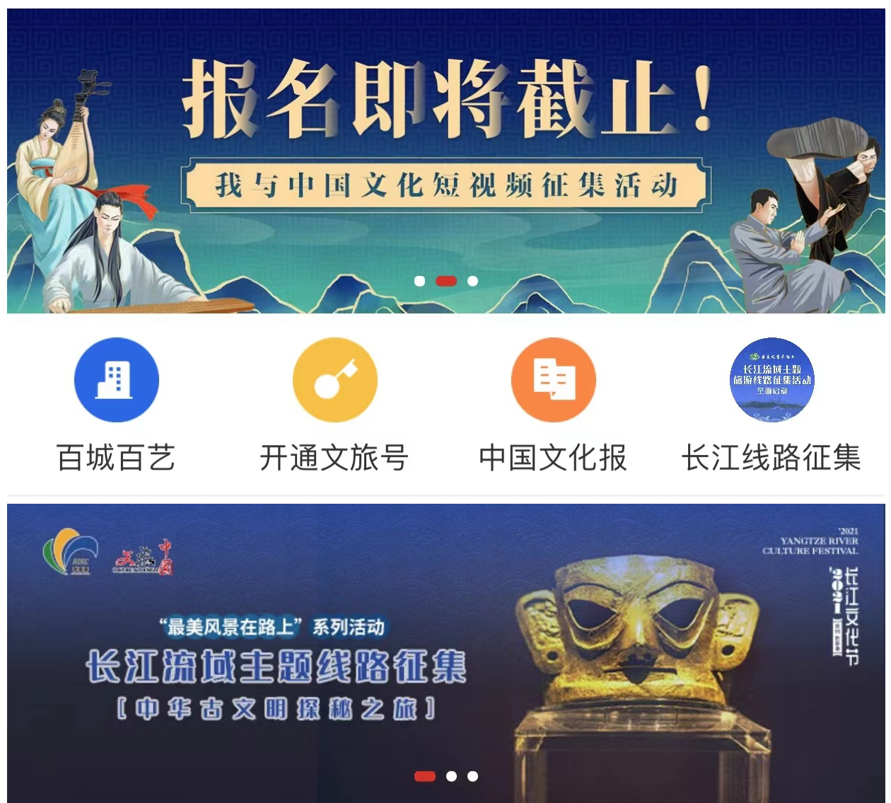 除此之外,“文旅中国·百城百艺——非遗传播活力排行榜”“最美风景在路上——大型自驾游主题活动”“文旅中国·文创产品大赛”“我与中国文化——短视频征集大赛”等重要品牌活动,都在文旅中国客户端内设有专题、征集及展示,欢迎各界关注参与。