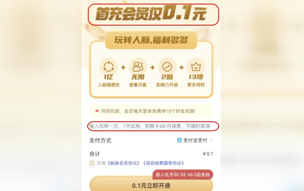 ——小字条款暗藏玄机。来自湖北的吴先生为了找工作方便,下载了“脉脉”App,并被“首充会员仅0.1元”的页面吸引。于是,他点击了金黄色的“0.1元立即开通”的按钮付费0.1元开通了会员。