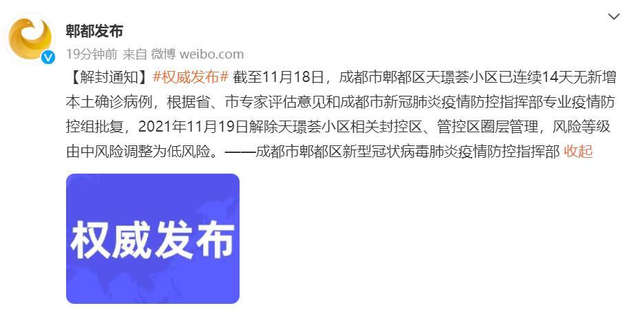 解封通知:截至11月18日,成都市郫都区天璟荟小区已连续14天无新增本土确诊病例,根据省、市专家评估意见和成都市新冠肺炎疫情防控指挥部专业疫情防控组批复,2021年11月19日解除天璟荟小区相关封控区、管控区圈层管理,风险等级由中风险调整为低风险。
