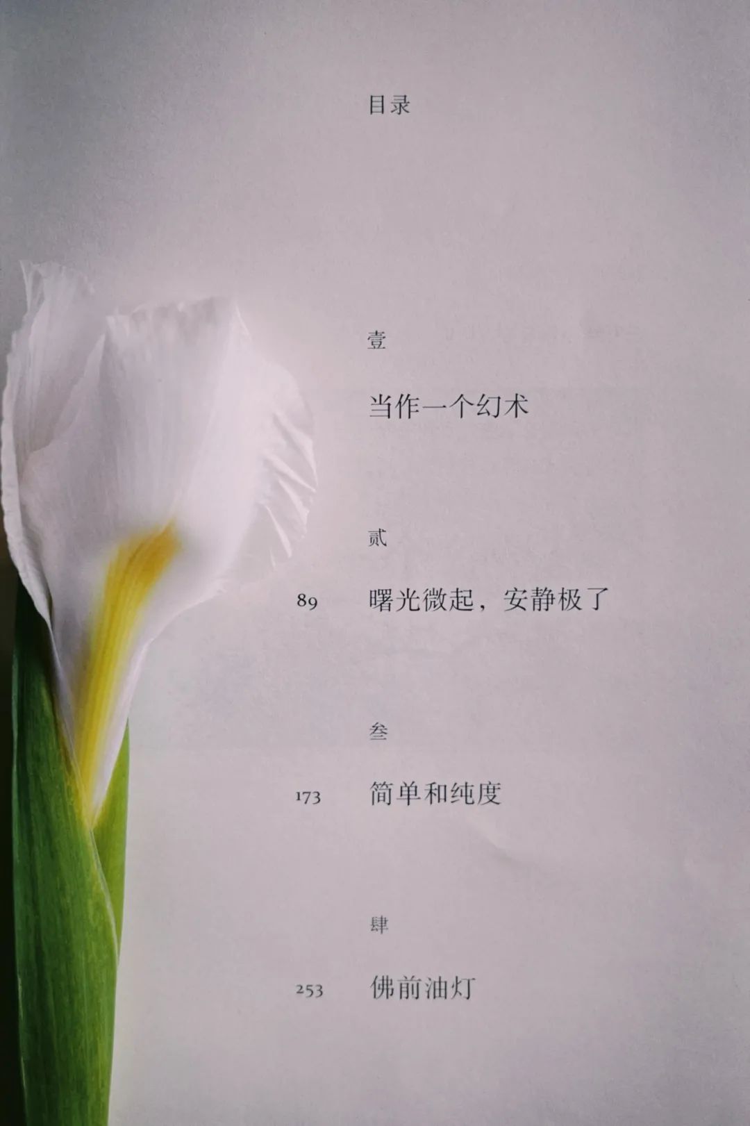 问:书分四部分,四部分标题似乎依次标示了一条隐约脉络,“当作一个幻术”“曙光微起,安静极了”“简单和纯度”“佛前油灯”。这些小标题与书中内容有着怎样的对应?